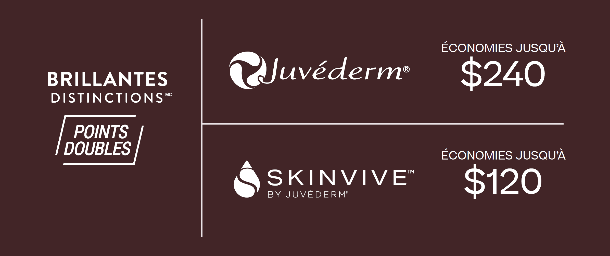 Cette offre est destinée aux membres du programme BRILLANTES DISTINCTIONS qui reçoivent un traitement JUVÉDERM ou SKINVIVE dans au moins deux zones du visage pour un montant minimal de 900 $ avant taxes. Il n’est pas possible de combiner les zones des traitements JUVÉDERM et SKINVIVE. Les traitements doivent être administrés, et les reçus des traitements téléversés sur votre compte BRILLANTES DISTINCTIONS, entre le 1er février 2025 et le 31 mars 2025. Les informations fournies sur le reçu et sur la page de soumission d’un traitement du portail BRILLANTES DISTINCTIONS doivent satisfaire aux exigences de soumission énoncées dans les conditions générales d’utilisation. L’offre est soumise aux limites applicables définies dans les conditions générales du programme BRILLANTES DISTINCTIONS. Des modalités supplémentaires peuvent s’appliquer.